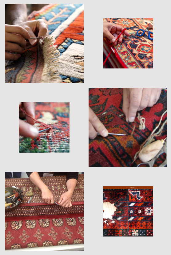Each repair job involves matching the original warp and weft knots and carefully fixing the edges and fringes with wool, cotton, or silk threads.
